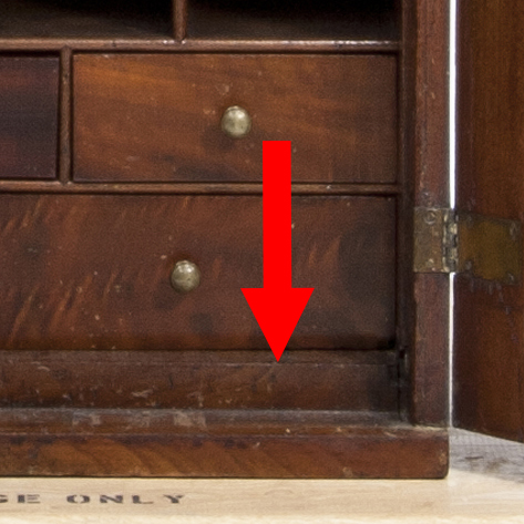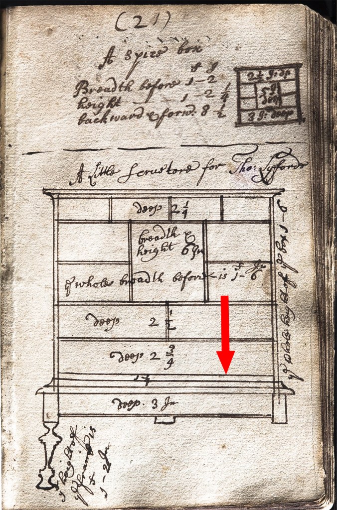 The arrow points to the upper edge of the board represented by the line in Widdifield’s drawing. The missing fall was hinged to this board. With the fall lowered and flush with the hinge board, the drawers of the lowest tier of the carcase could be opened and accessed.