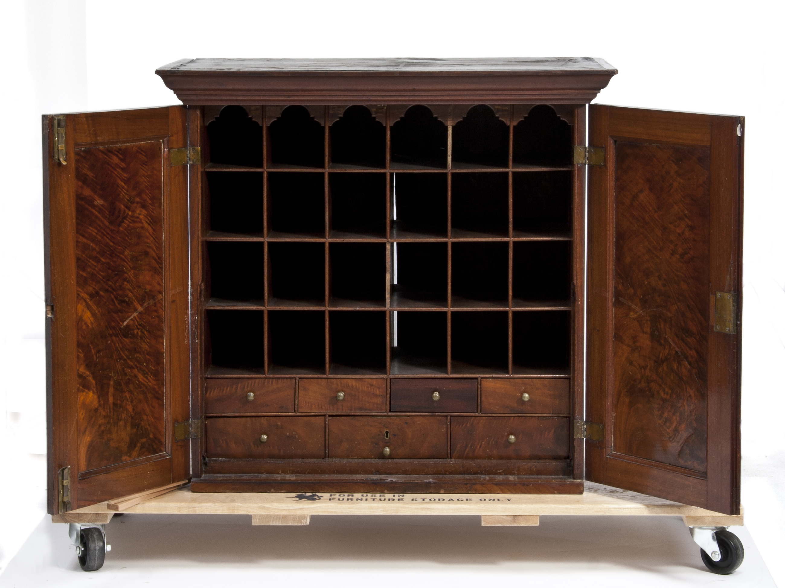 This is the top section of a full size scruetore or scriptor made in Philadelphia c. 1710 that is missing its fall which was located behind the pair of paneled doors. The fall was half the height of carcase. Scratches are visible on the inside of the doors from the fall being raised and lowered.