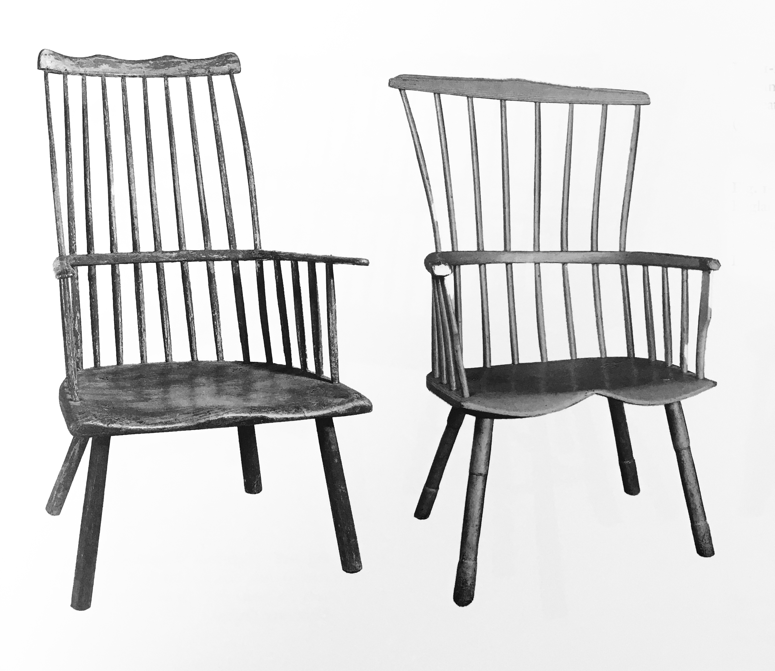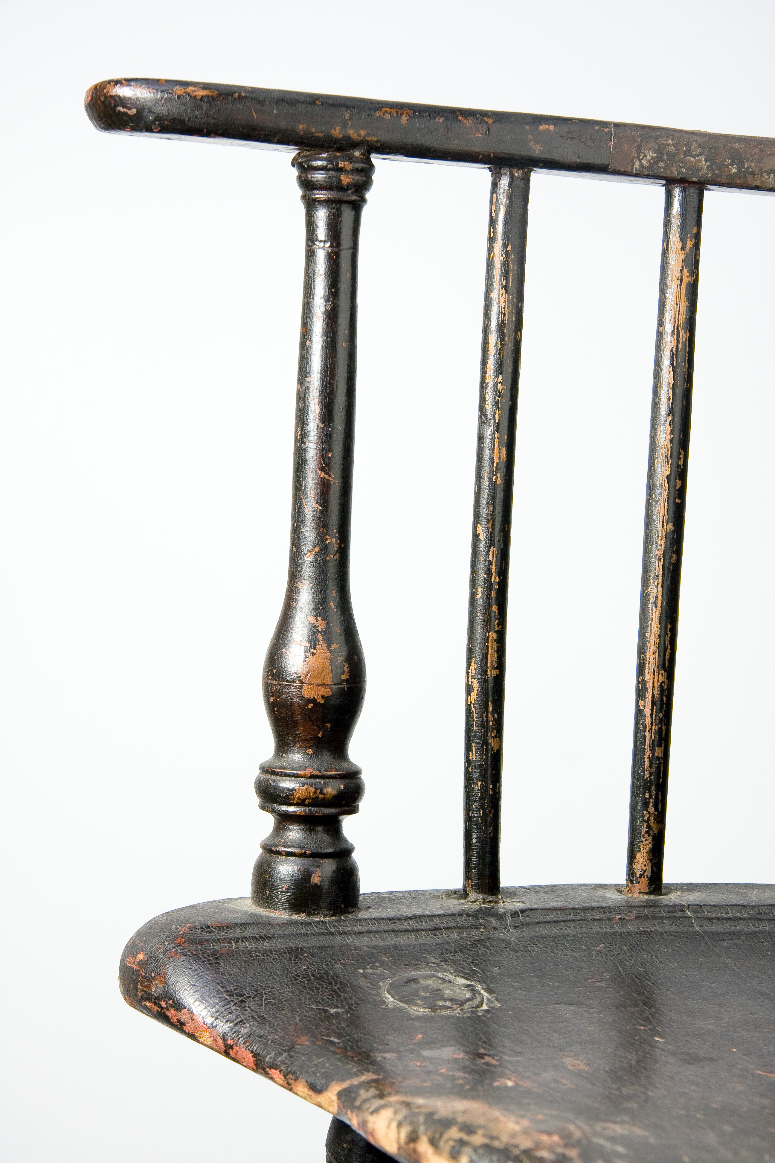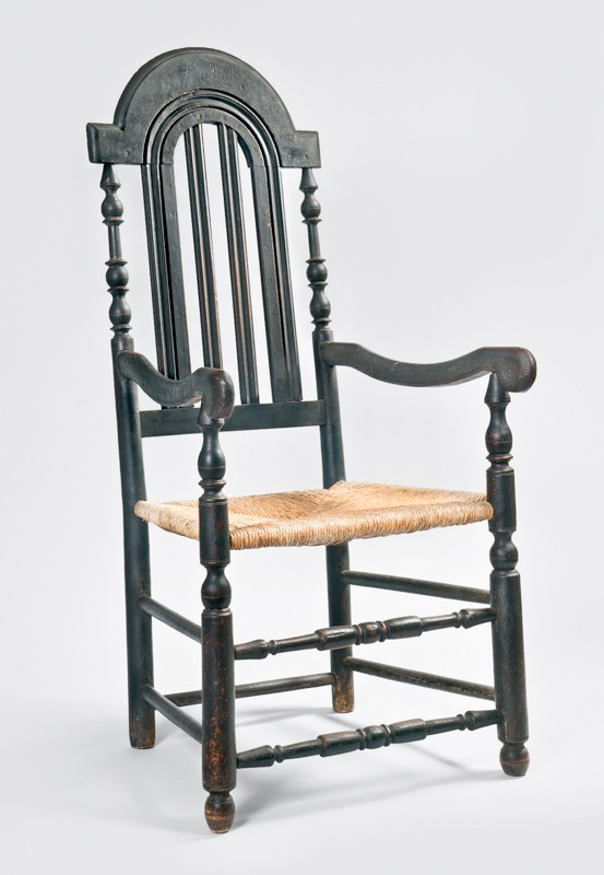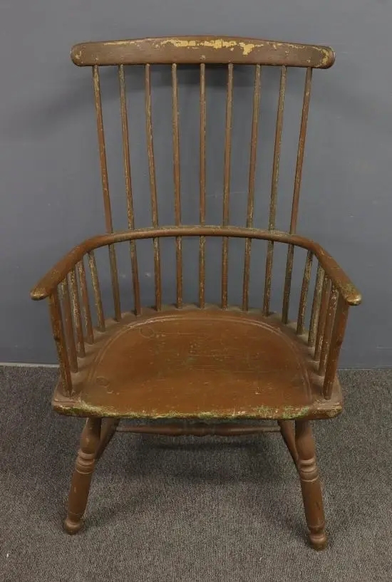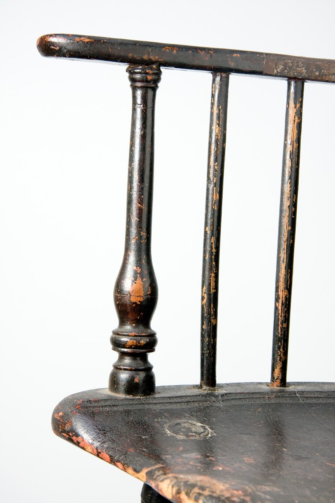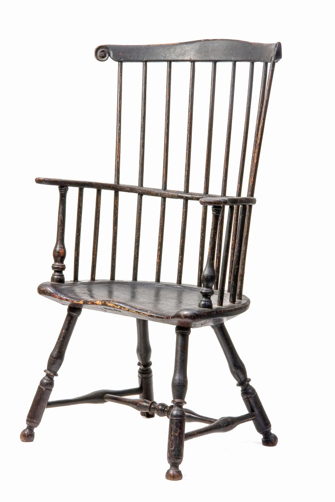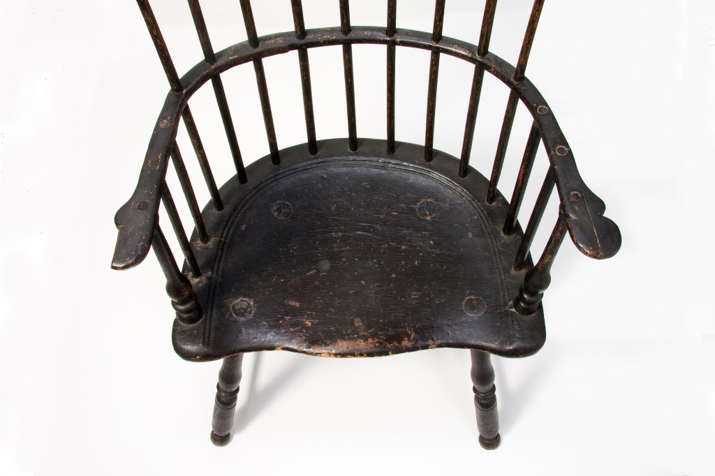 A very brief story of the origin of Windsor chairs is that they were first produced in the early eighteenth-century in the grounds around Windsor Castle, a little over 20 miles west of London. Their appearance was defined by a shaped plank seat with plain turned legs socketed into the bottom of the plank while short and long shaved spindles emerged from the top of the seat, passing through a bent arm-rail. The long spindles were finally socketed to a plain crest. The earliest written reference of English Windsors dates to 1724, though they probably had been in production for at least a decade before that. The royal household was purchasing Windsors by 1729 and they are frequently mentioned in probate inventories in the following years. The earliest Windsors produced were high-back armchairs. “Five Windsor Chairs” in the 1736 estate inventory of Patrick Gordon, a lieutenant governor appointed by William Penn who arrived in Philadelphia in 1726 were English Windsors brought over by Gordon to furnish his residence. These and other English chairs would have encouraged Philadelphia chairmakers to begin local production of this new, popular chair form, the first colonial American makers to do so.
