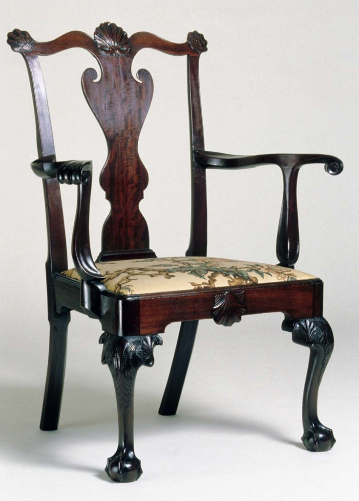 Armchair, Philadelphia, Penn. 1755-1765. Artist Unknown. Mahogany, hard pine. Winterthur Museum. Carved handholds on Philadelphia Windsor armchairs were adapted from the arms of contemporary high-style chairs in walnut and mahogany.