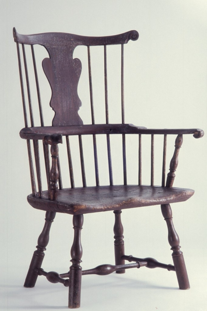 High-back Windsor armchair, Philadelphia, Penn., 1765-1775. Artist unknown. Yellow poplar seat and medial-section of arm, Maple legs and stretchers, Hickory crest rail, Mahogany arms, arm supports, and short spindles behind the arm supports. H. 43 3/4″, W. 32 1/4″, D. 26″ Dietrich American Foundation. The armchair has been on loan to Stenton since 1971.