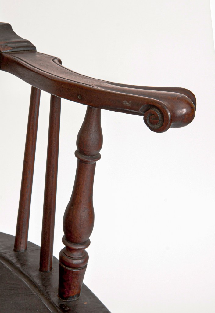 High-back Windsor armchair. Philadelphia, Penn. Dietrich American Foundation. Detail of the mahogany arm, arm support and short spindles. The carved volutes on the handhold mirror the volutes carved at the ends of the crest-rail.