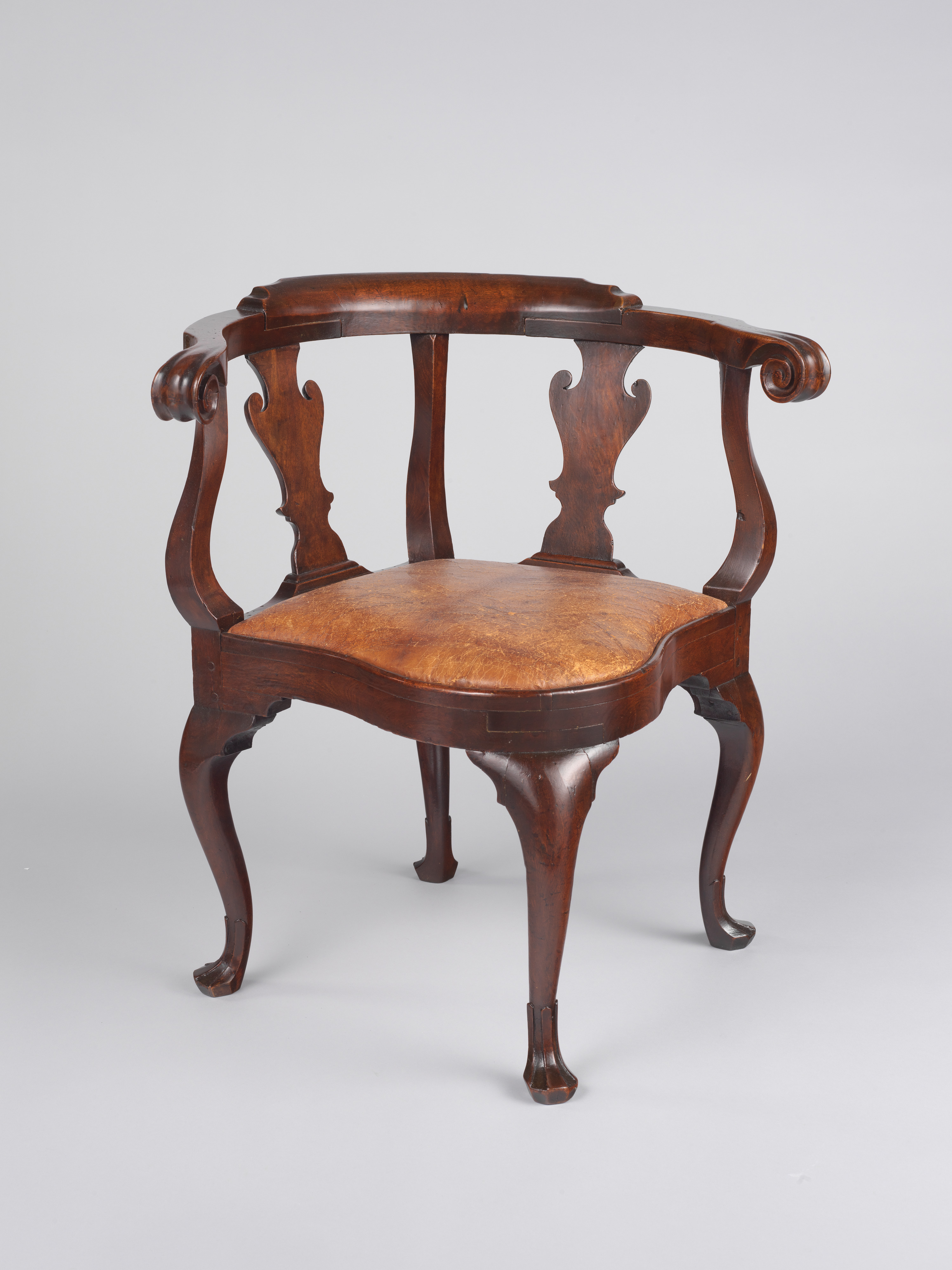 Corner chair, Philadelphia, Penn. 1740-1750. Artist unknown. Metropolitan Museum of Art. The same three-part arm construction used on corner chairs was used on early Philadelphia low-back chairs and some high-back armchairs.