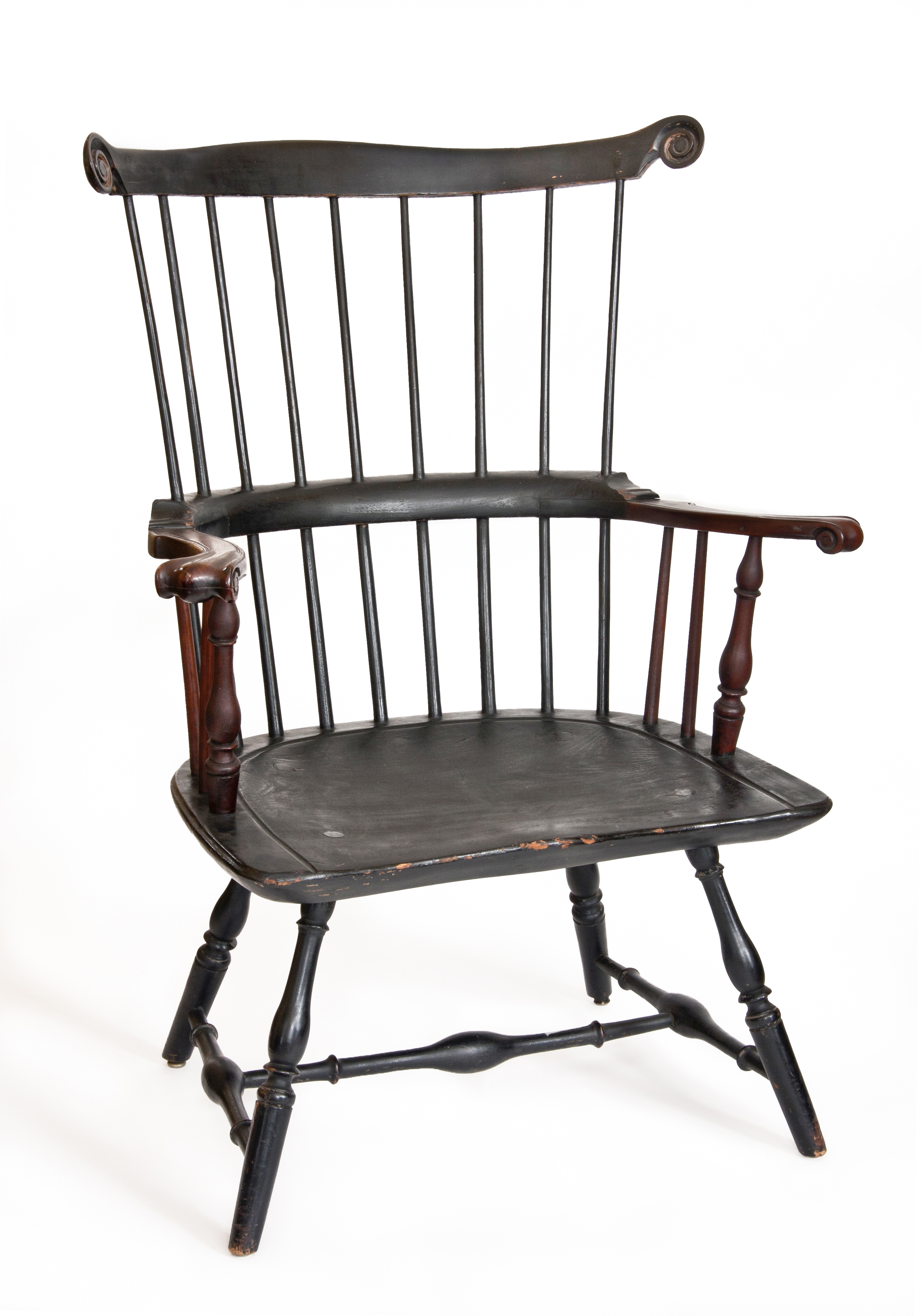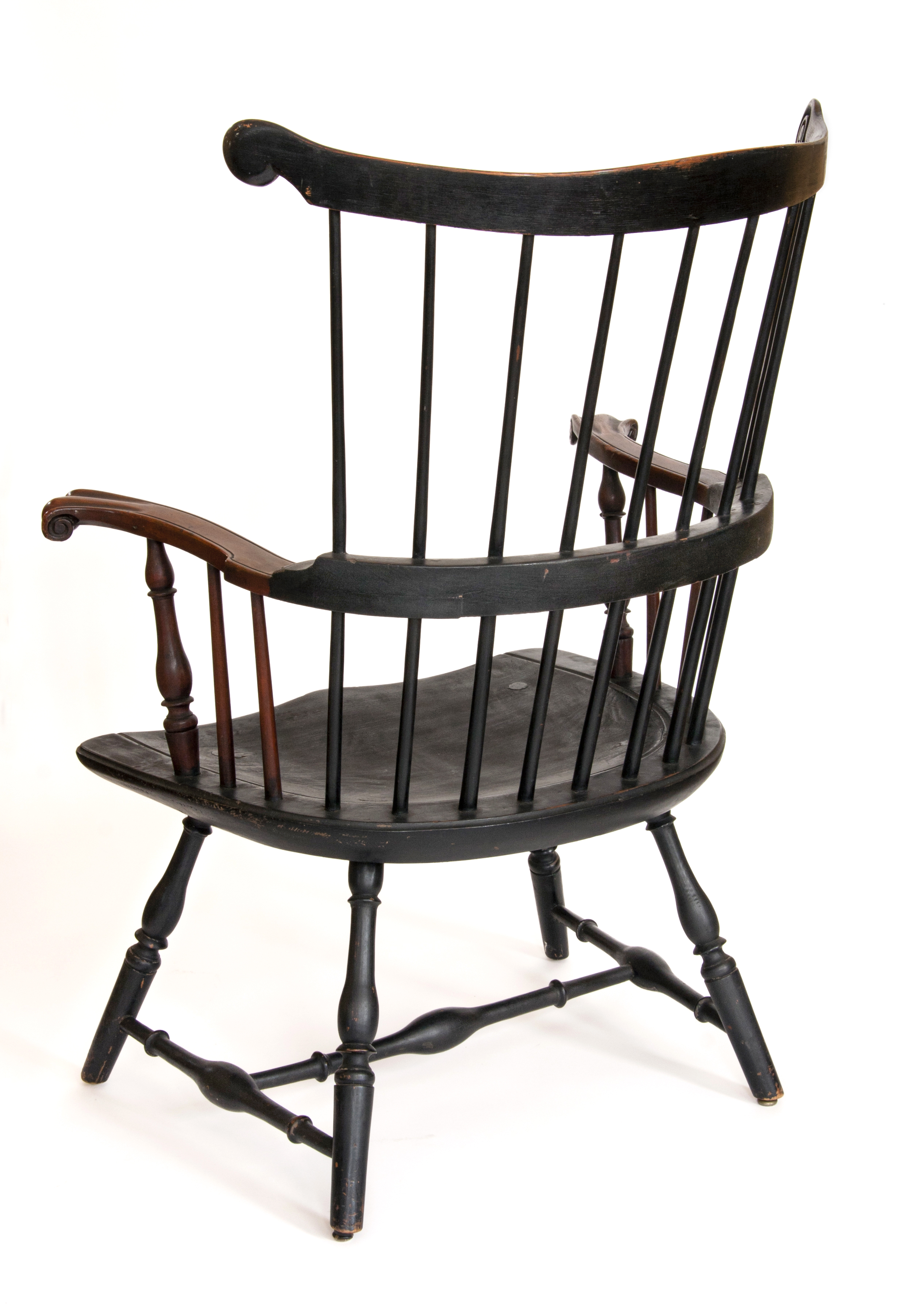 Other points of note are the arm supports being placed at a great distance from the front of the seat, and the three-piece arm, derived from high-style corner chairs and adapted for early Philadelphia low-back Windsors. The three-piece arm construction would continue to be an option for oval and shield seat high-back chairs and sack-back Windsor armchairs.