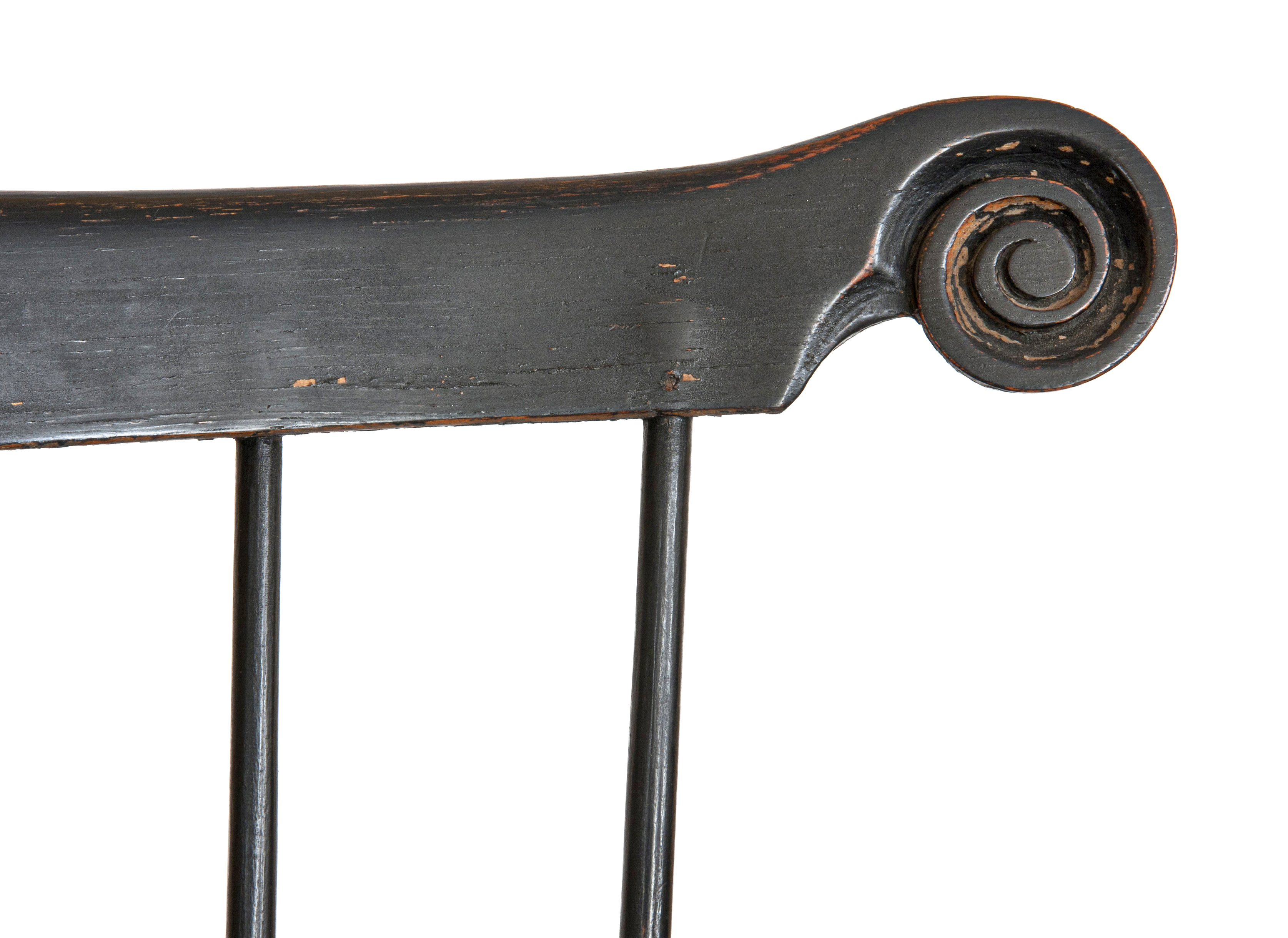 High-back Windsor armchair. Philadelphia, Penn. Dietrich American Foundation. Detail of the carved volute on the crest rail.