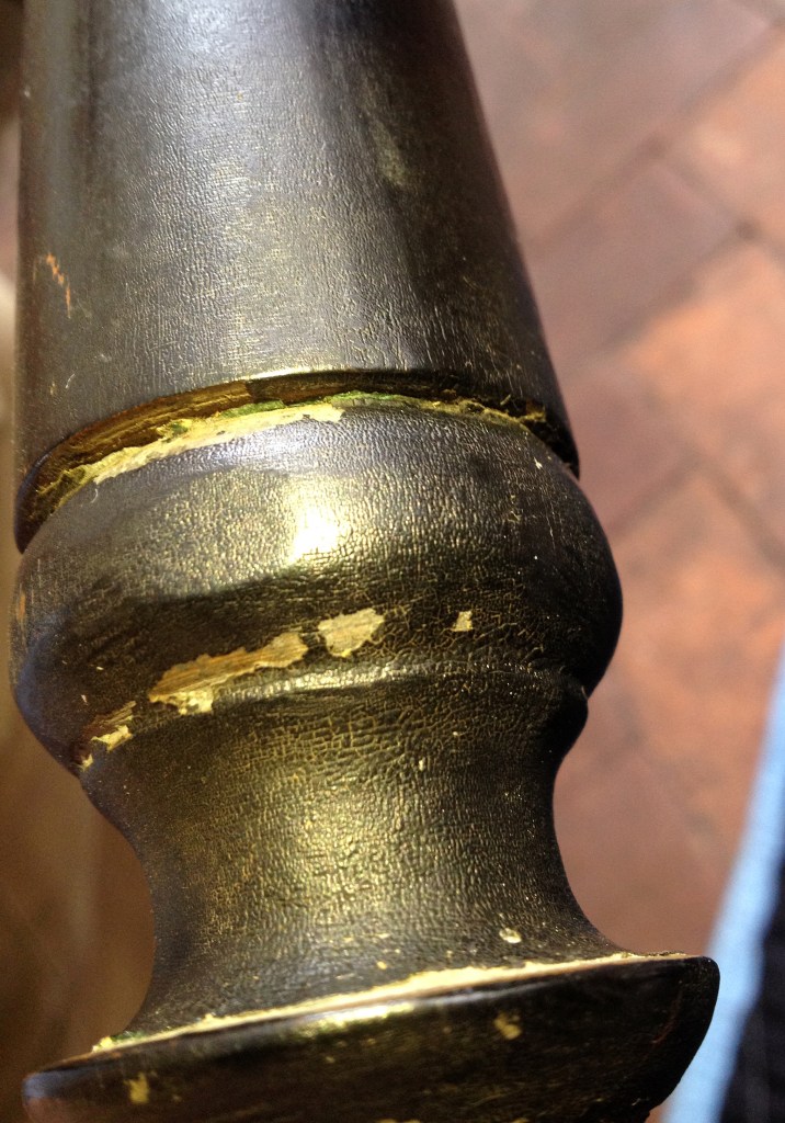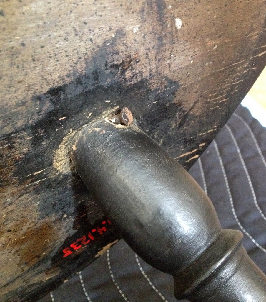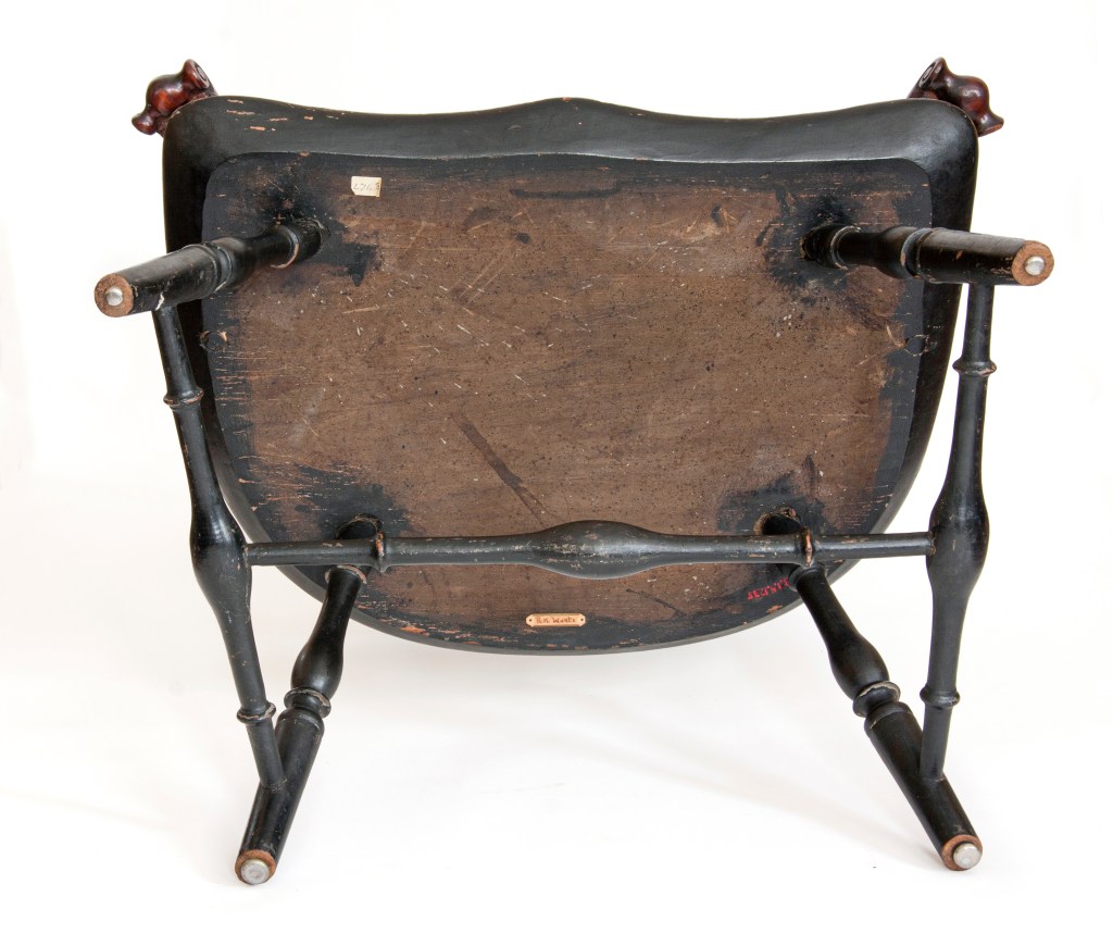 I want to make a correction to the previous post about the over-size high-back Windsor armchair in the Foundations collection. It has been on long-term loan to Stenton where I examined it several years ago. It was a cloudy winter day and I did not take the chair outside where there would have been only slightly better light to inspect the chair. The two short spindles behind the arm supports have the same darkened varnish the mahogany arms and arm supports have, not the later black paint seen on the rest of the chair. I could not see any traces of the original green paint on or around the short spindles. I speculated then that the short spindles were made of mahogany. I didn’t understand what purpose there would have been for the maker to use mahogany the short spindles. I recently had the opportunity to examine the arm chair again on a warm, bright sunny day. This time, close scrutiny of the spindles in sunlight showed them to be made of hickory like the other long spindles, explaining the mystery of why relatively minor elements of the chair would be made of an exotic wood species.