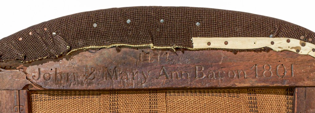 John Bacon (1779-1859) and Mary Ann Warder Bacon (1782-1863) were married in 1801, the year carved after their names on the front loose seat rail. 1801 is also the year John Bacon’s father, Job Bacon (1735-1801), died. One auction catalogue essay proposes that this suggests the earliest known owner is Job Bacon but gives no evidence for his ownership. As we’ll later see, John and May Ann Bacon’s marriage had great meaning to them over their lifetimes and the date on the chair may just as well honor their betrothal than the death of Job. John Bacon was Treasurer of Philadelphia from 1816 to 1829, Treasurer of Pennsylvania Institute for Deaf and Dumb 1820-1859, and the eighth Inspector of Eastern State Penitentiary 1831-1859. Mary Ann Warder Bacon was the daughter of John (1751-1828) and Ann Head Warder (1758-1829), and the great-granddaughter of the joiner John Head.