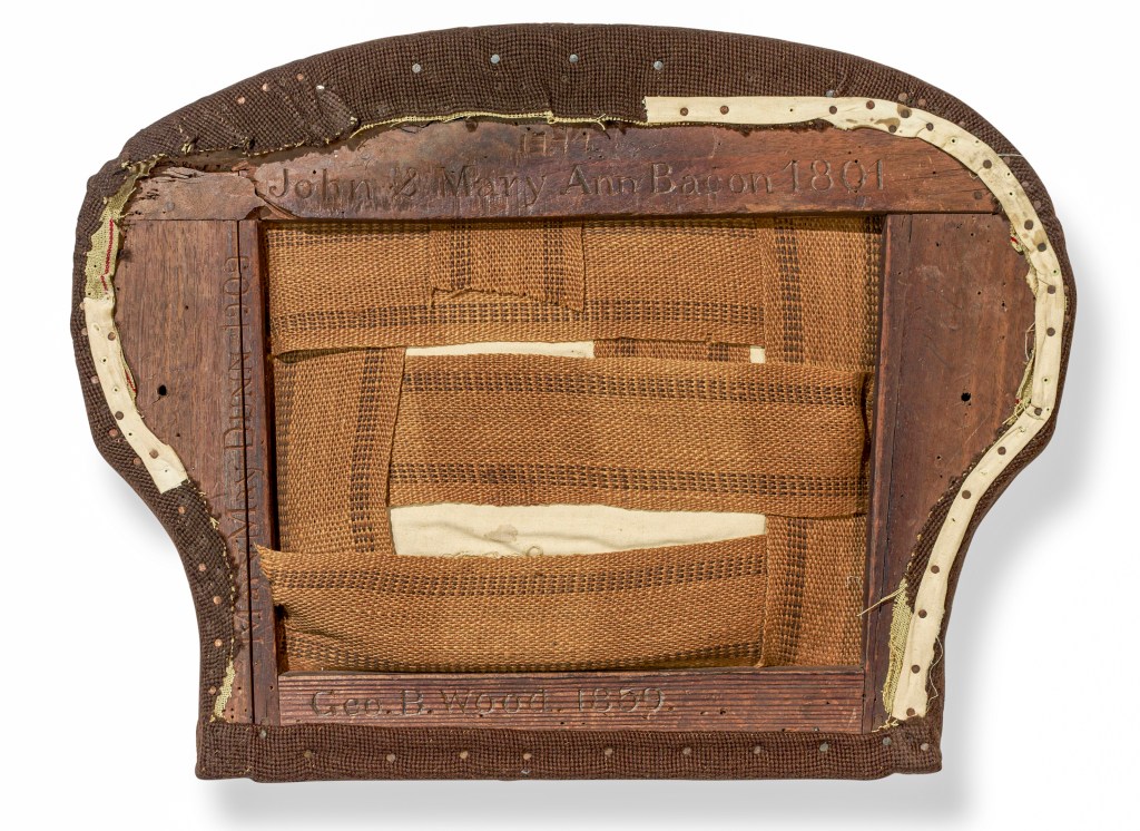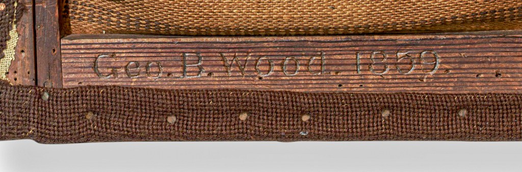 “Geo. B. Wood 1859” is carved on the rear rail of the seat frame. George Bacon Wood (1832-1909) was the grandson of John and Mary Ann Bacon whose names are on the front rail. The date carved after G. B. Woods name is the year his grandfather died, when George was 27 years old. In 1859, if this was the year G. B. Wood took ownership of the chair, Mary Ann Bacon had eight living children. It is unclear why the chair did not go to one of them before passing to the next generation. George’s mother, Elizabeth Head Bacon Wood (1807-1846) died young and perhaps the chair had been promised to her while her brothers and sisters were bequeathed other cherished objects. The chair could have been bequeathed to her son in her memory.