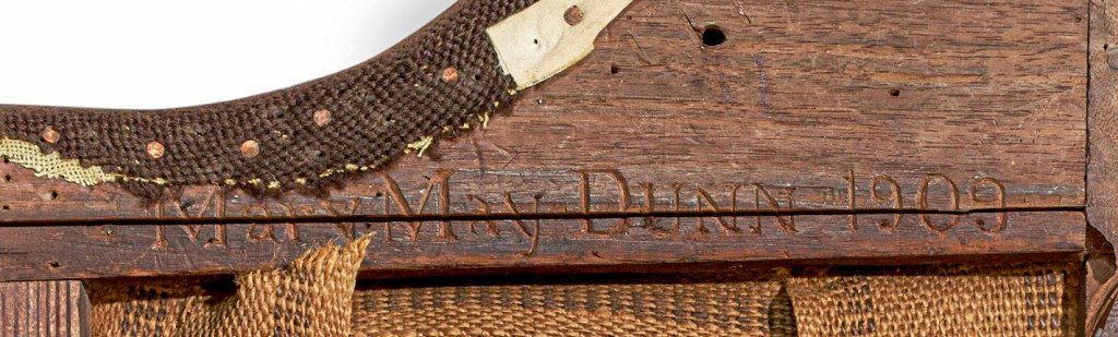 What are we to make of this succession of names and dates on the loose seat frame and when do we think they were carved? Whenever the chair changed hands or all at once? If all at once, in 1909 or later? We’ll have a closer look at the armchair in person and on zoom tomorrow but I don’t promise any answers yet! Clicking on the photos enlarges them to assist in a determination.