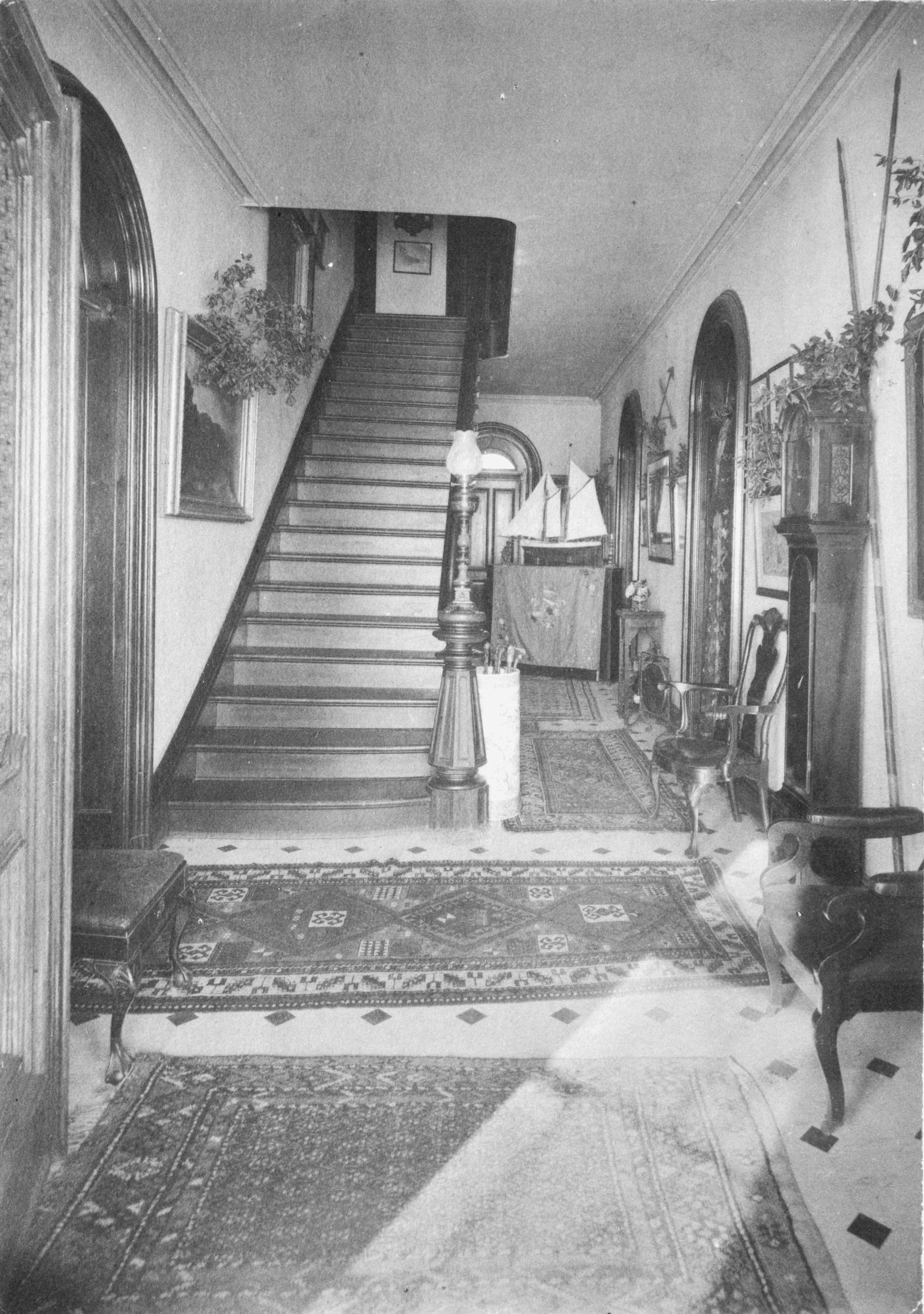 A view of the stair hall in Mary May Wood Dunn’s (1859-1936) house. Mary May Dunn was eldest the daughter of George Bacon Wood and Julia Keim Reed (1836-1887)