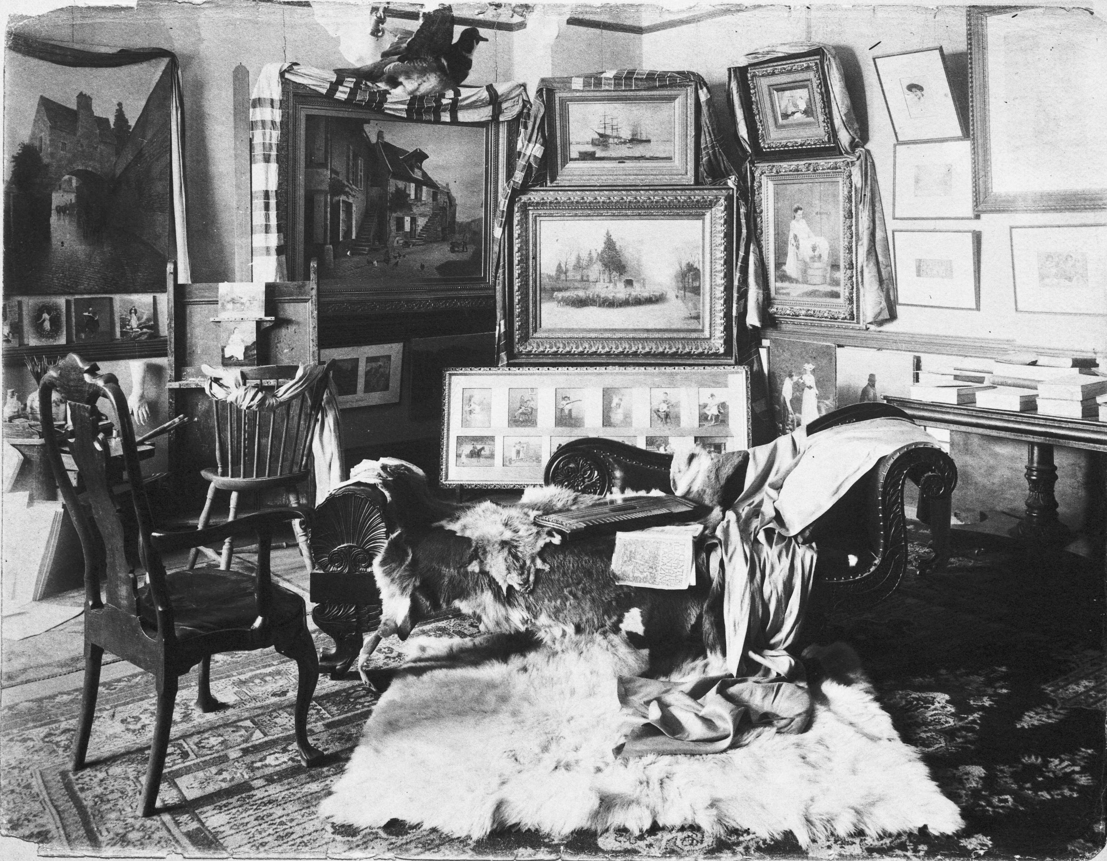 The Bacon/Wood/Dunn family armchair in George Bacon Wood’s studio with his paintings and photographs on display. The Library Company of Philadelphia.