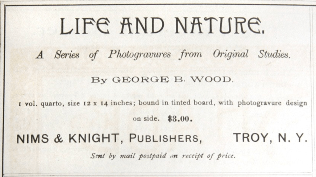 Advertisement for Wood’s album of Japanese tissue photogravures, 1889, reproduced in Ernest Edwards periodical “Sun and Shade”, June 1890.