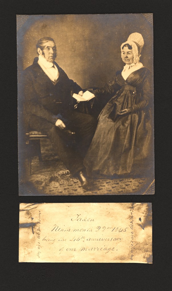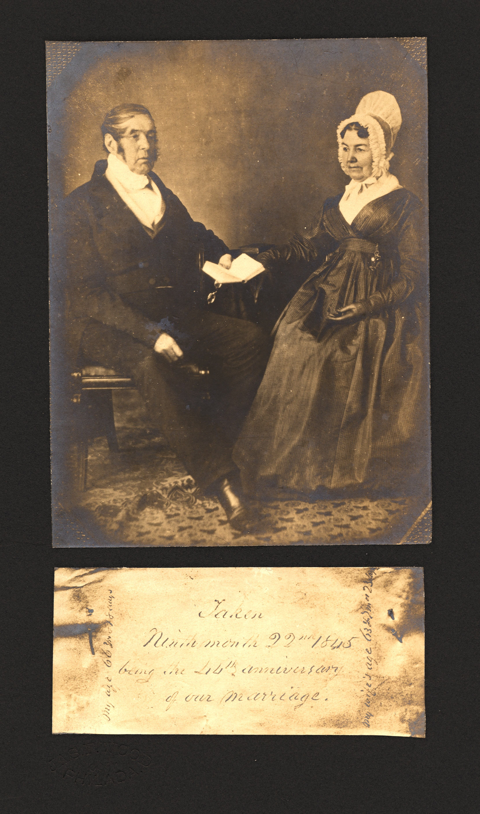 The following year they had a daguerreotype portrait of themselves “Taken Ninth month 22nd 1845 being the 44th anniversary of our marriage.” James Francis Wood (1846-1929), one of John and Mary Ann Bacon’s grandsons, and the younger brother of George Bacon Wood, would make a photographic copy of the original daguerreotype for a family Christmas card in 1910.