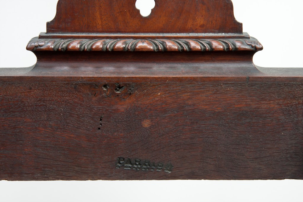 John and Mary Ann Bacon were not the only Bacon family members who thought to memorialize objects in their possession. William Henry Bacon (1815-1882), the fourth son of John and Mary Ann Bacon to survive to adulthood, had a Philadelphia wainscot side chair inscribed in white paint on the bottom of the seat board – “THE Wm. PENN CHAIR/The property of Wm. H. BACON.” It is unknown where he acquired the chair, or when he had it inscribed. What is important is that he believed it was once owned by William Penn and so had a special importance aside from its intrinsic value as part of the history of woodworking in Philadelphia.