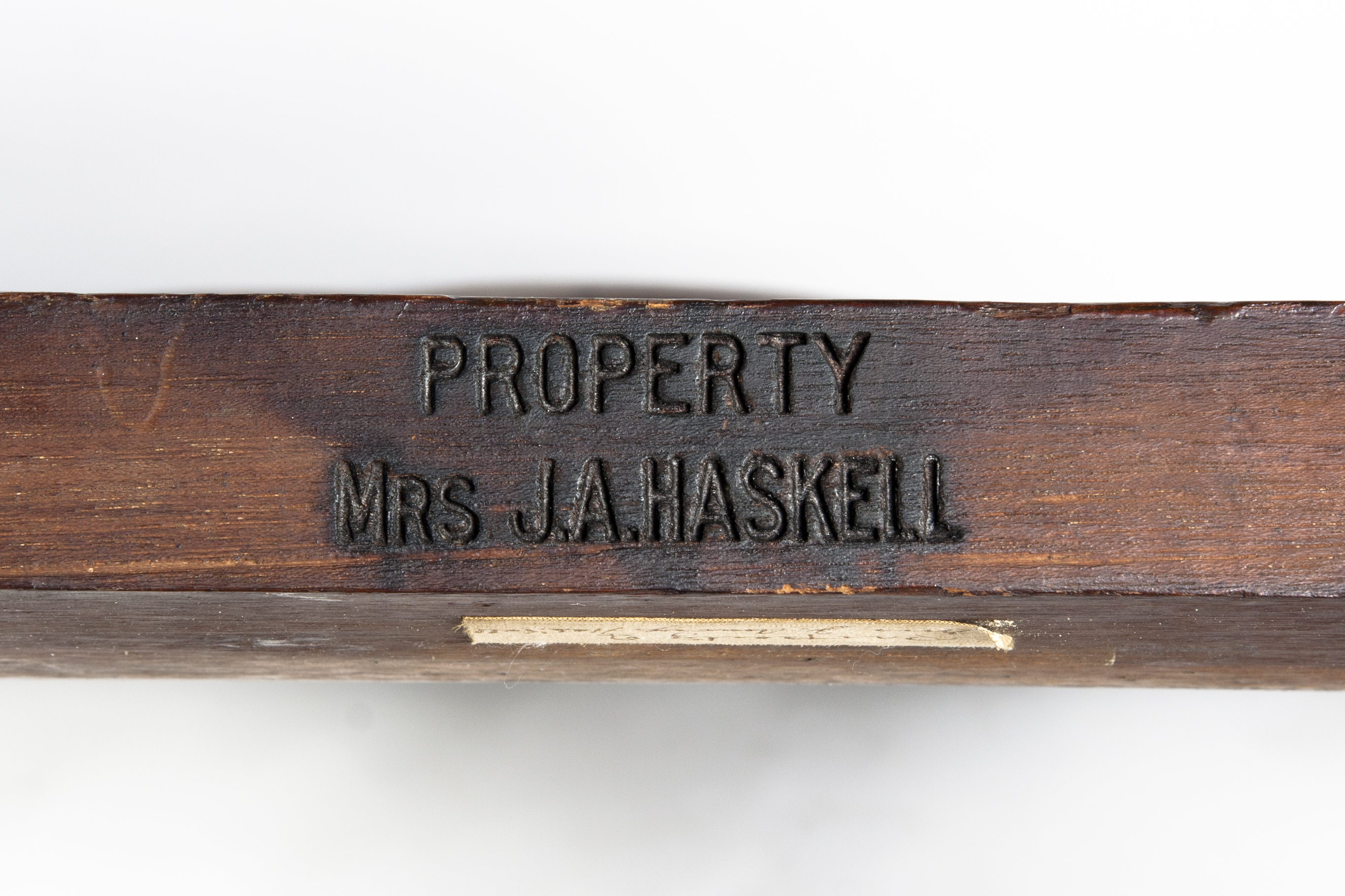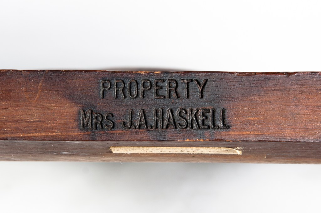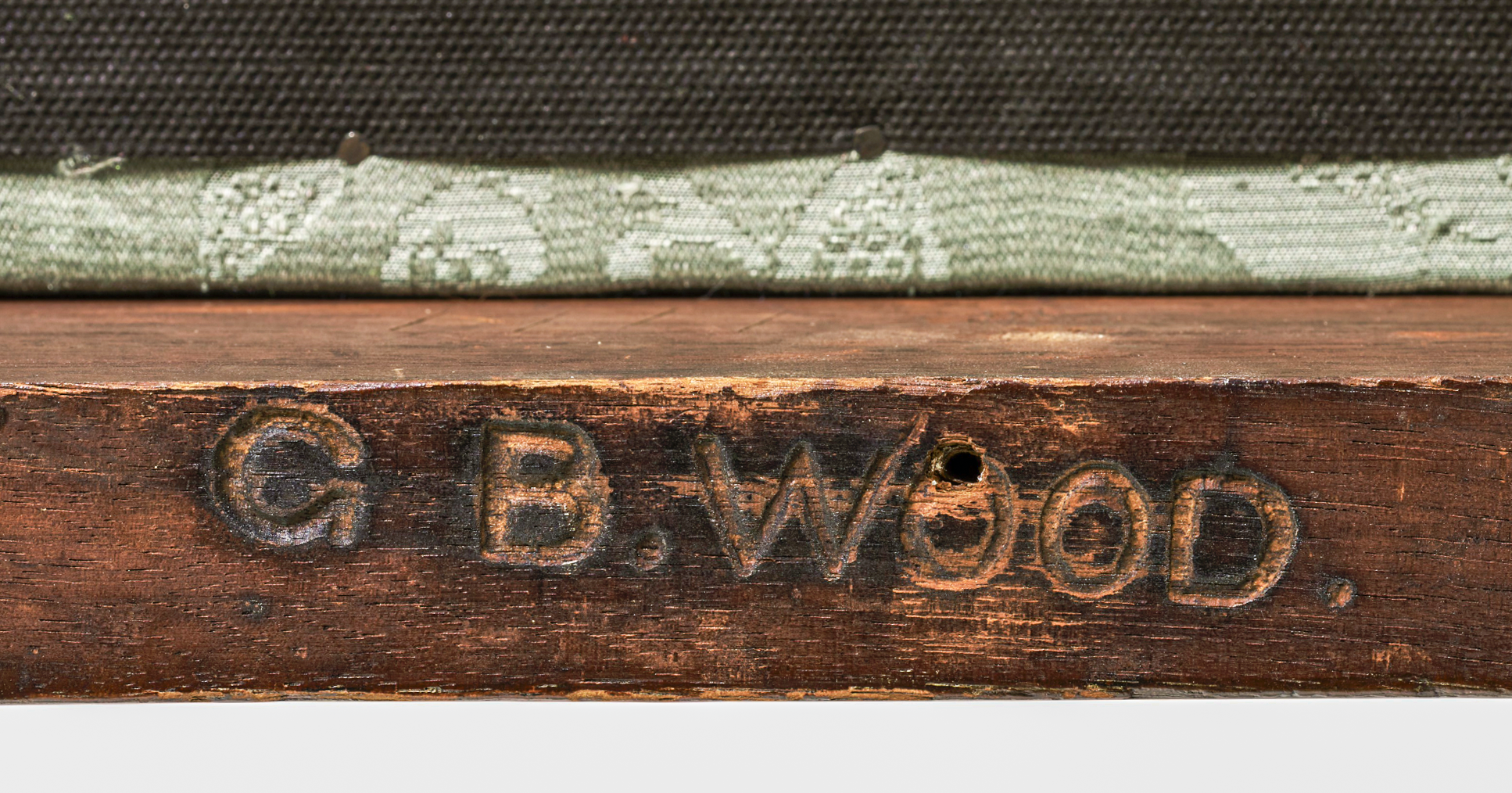 The G. B. Wood marks on the bottom of the seat rails appear not to be carved but rather made with a branding iron. We don’t know what precipitated Wood’s purchase of a branding iron. Did he already own it and use it to mark possessions before he inherited the armchair or did he order it specifically after acquiring the chair? Did he mark other objects with it and if he did, do any of them survive? Interestingly, he branded the chair in two places; in my experience the majority of brands on furniture are singular.