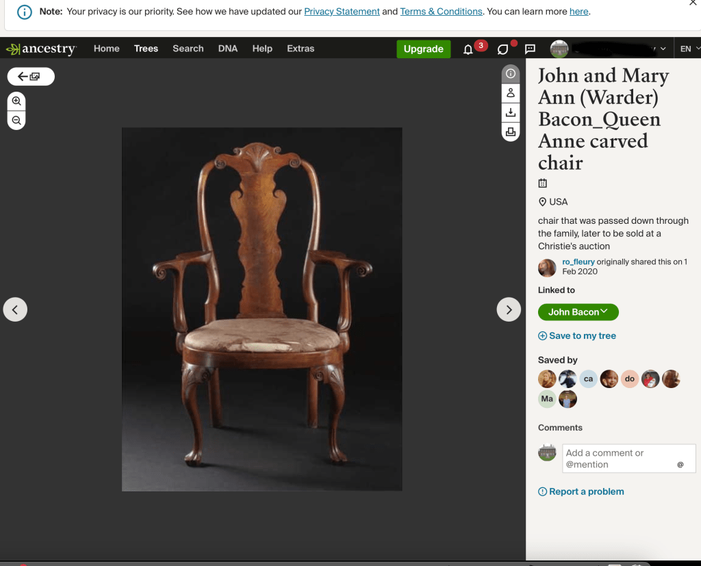 Bacon descendants have used the Internet to research possessions that have left the family. In 2020, an image of an armchair that sold at Christie’s in January 2016 was posted on Ancestry.com described as the chair belonging to John and Mary Ann Bacon. But this is not the Bacon’s chair, which was sold at Christie’s in 2022, two years after this posting. The armchair on Ancestry.com is a chair formerly in the collections of the Philadelphia Museum of Art and the Wolf Family.