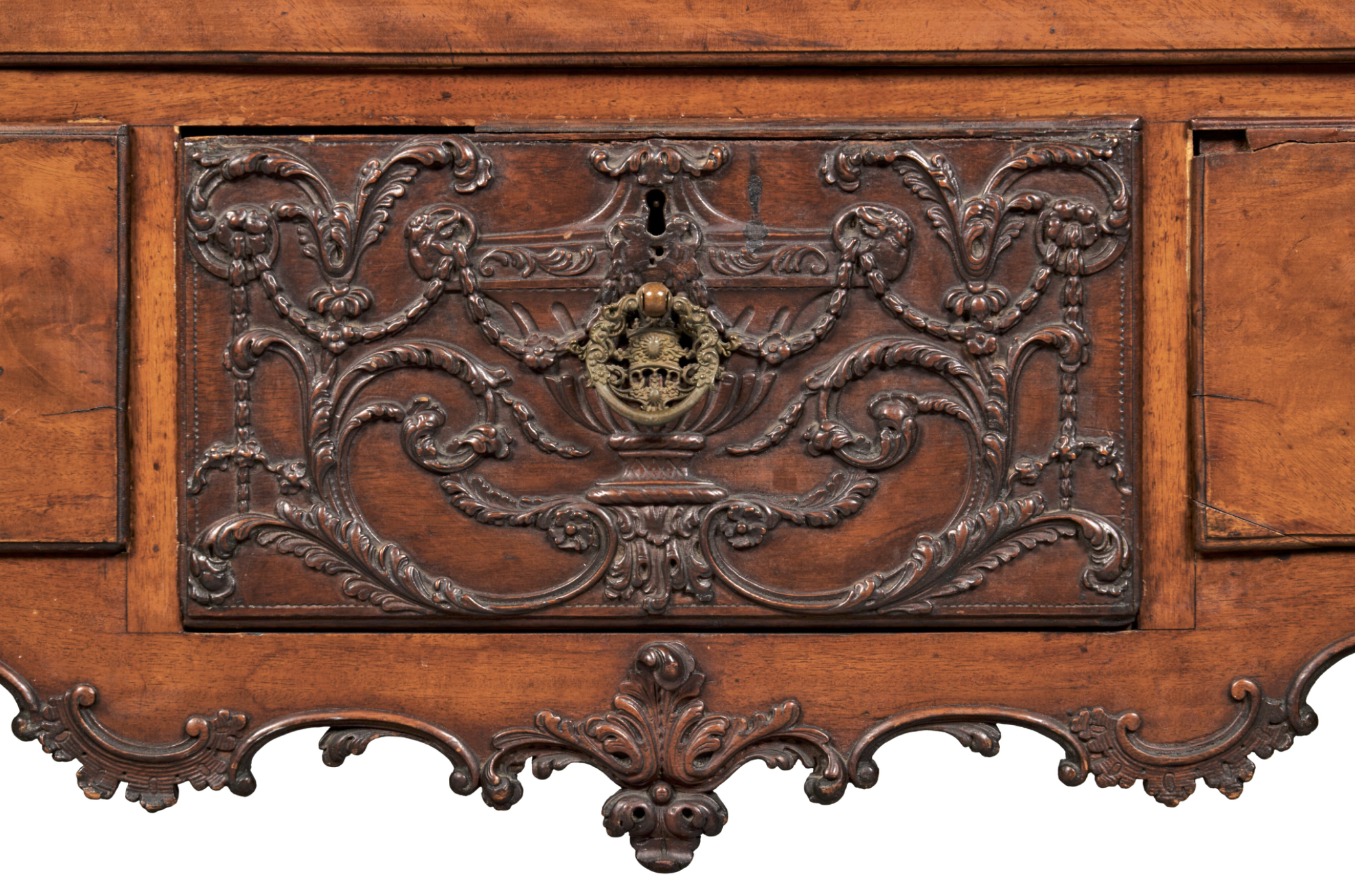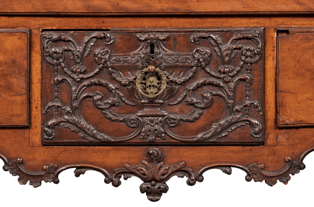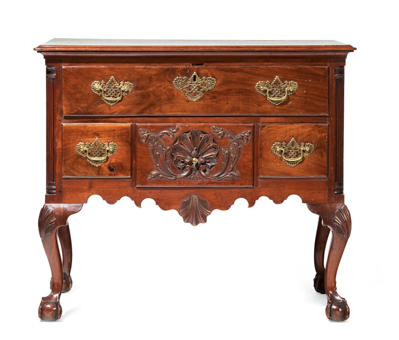 I’ll begin with what is being called the “Laird” family high chest base as it was owned by Mrs. William Winder Laird (Mary Alletta Belin DuPont Laird, 1878–1938) of Wilmington, Delaware in the first quarter of the 20th century when William Macpherson Hornor, Jr. had it photographed for his Blue Book of Philadelphia Furniture, published in 1935. It has not been published or written about since then. It’s not known how the Laird’s came by the high chest base though it is likely an object they collected rather than inherited. It is lot 111 in Sotheby’s “Important Americana” sale and can be found here. As it is the base to a high chest, the current wood top was added after the base and upper section were separated. A band of fret from above the long drawer is missing. The brass pulls are said to be original with a fire-gilt coating. Though the majority of the carving along the bottom rail is carved from the solid, a small appliqué of wood laminated to increase thickness has been applied at the top of the central carved motif. If original, what an incredible survivor.