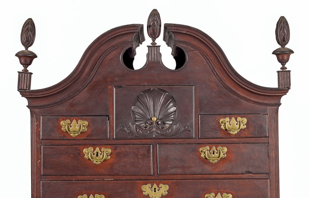 Next up at Sotheby’s is lot 78, a previously unpublished high chest that descended in the Reynell and Coates families of Philadelphia. In auction house speak it has survived “untouched” which is code for having little to no restoration though obviously it has been “touched” constantly since it was made in the early 1750s. It has a few losses and there appears to be accumulations of multiple layers of varnish in various states of deterioration. It is “in the black,” which is marketplace speak for, well, having multiple layers of varnishes in various states of deterioration. Sotheby’s couldn’t come to a consenus in attributing the carving so it is an “and/or” attribution to Samuel Harding or Brian Wilkinson. Perhaps they could have included Brian’s father Anthony, who died in 1765 and was also a carver. The chest also is said to retain its original brass hardware. It can be found here.