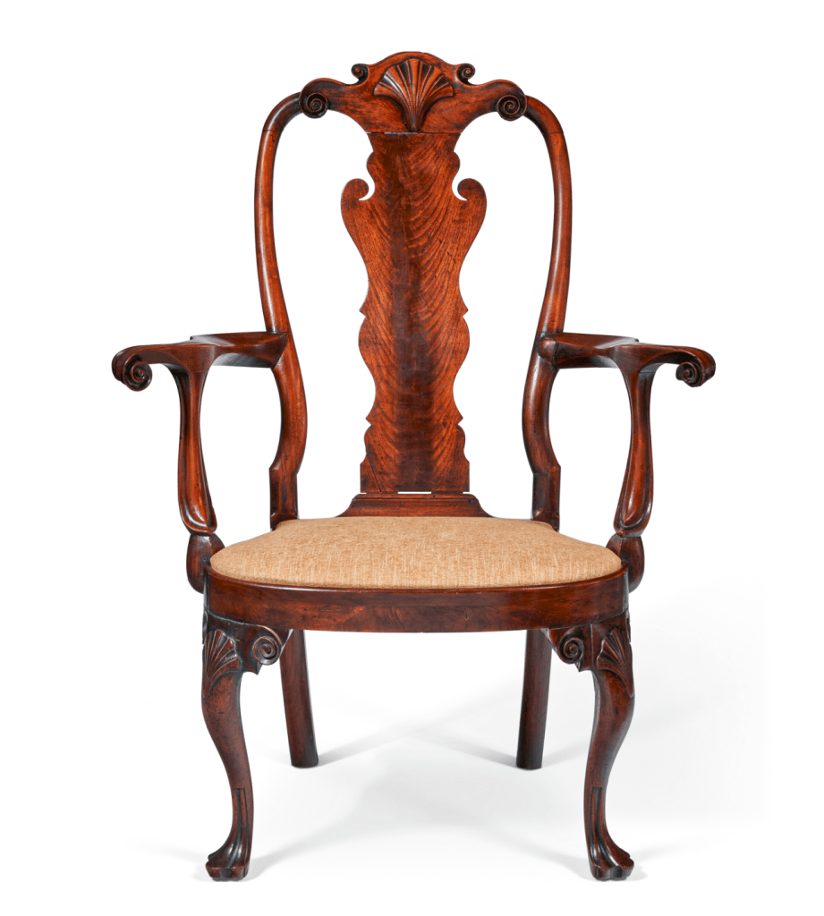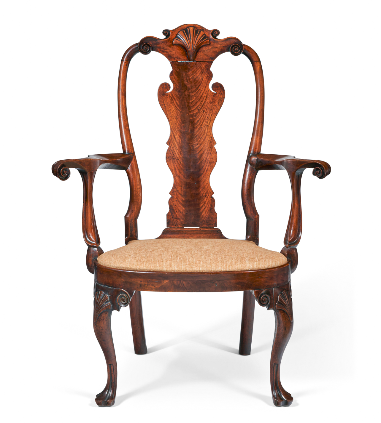 Also at Christie’s, lot 563 is another Philadelphia armchair from the only known set of compassed armchairs. I have previously written about this set of armchairs after examining one of the set that was on loan to Stenton last year. You can find those posts here and here. The chair for sale in January is marked II on both the interior surface of the rear seat rail and on the loose seat. The highest number of any of the surviving chairs is VIII. The newly discovered armchair shares design, construction, and wood choice with most of the other armchairs of the set including iron braces on the back of the joint at the juncture of the crest and stiles. Christie’s believes these iron braces are original to the armchairs though they do not give a reason for their conclusion. They suggest that they were “… perhaps added because of the chairs’ exceptional height …” though normal size side chairs from the same shop also have the iron braces. I’m going to go back and re-read all the auction catalogue entries for armchairs from this set as I’m not sure the very closely related side chairs have ever been mentioned. Similar braces on the side chairs counters the argument that the braces were added due to the great height of the armchairs. There is debate in the field about whether the braces are original or not, but no convincing arguments for either position have been made available. It can be noted that there is no damage to the chairs at the locations of the iron braces, they are not there to stabilize breaks in the joinery.