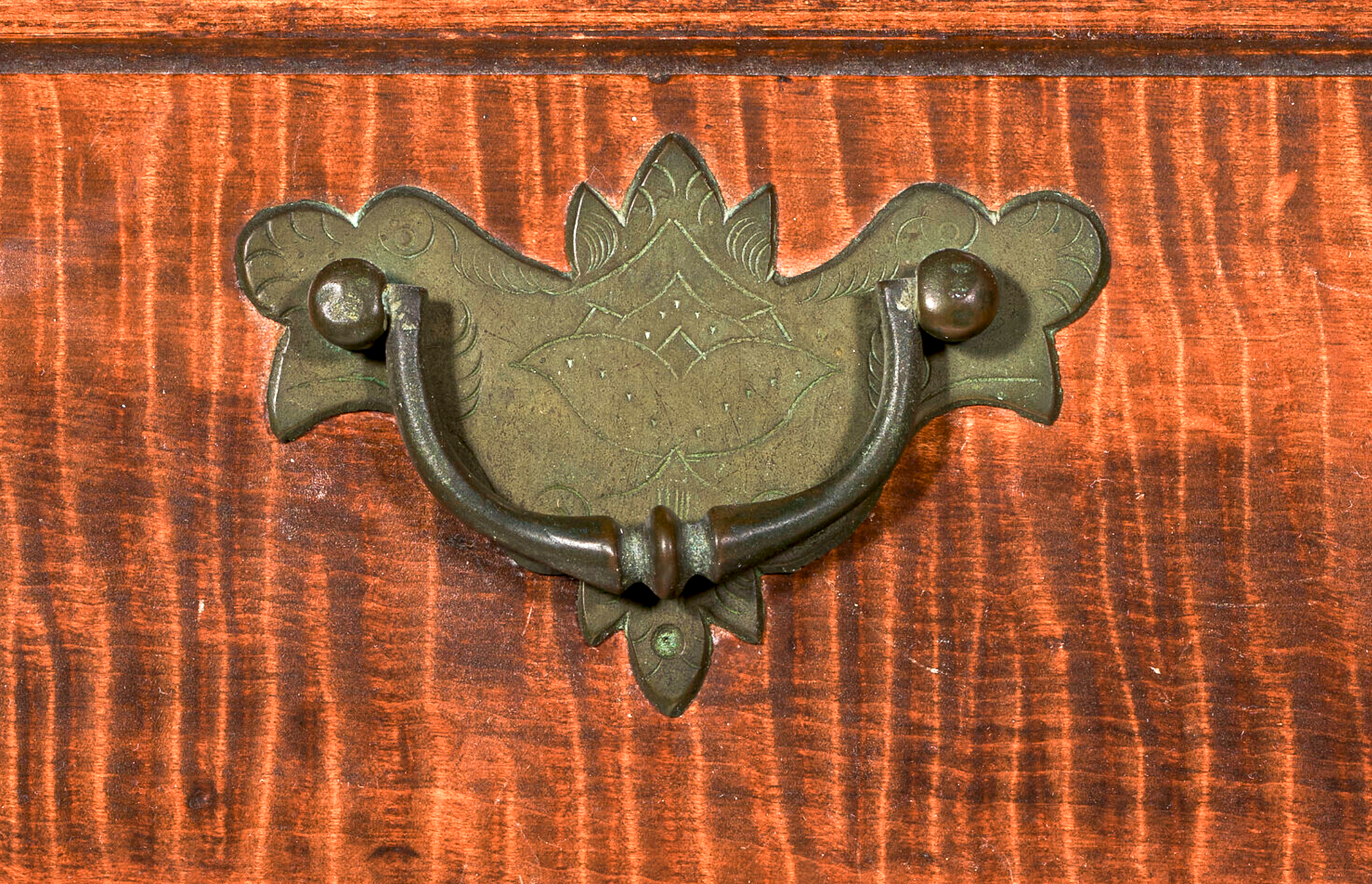 The shape and “lotus” motif engraving of the brasses on the maple high chest at Christie’s differ from others I recall on other furniture or in British pattern books. I wonder whether they might have been cast over here. Has anyone encountered them before?
