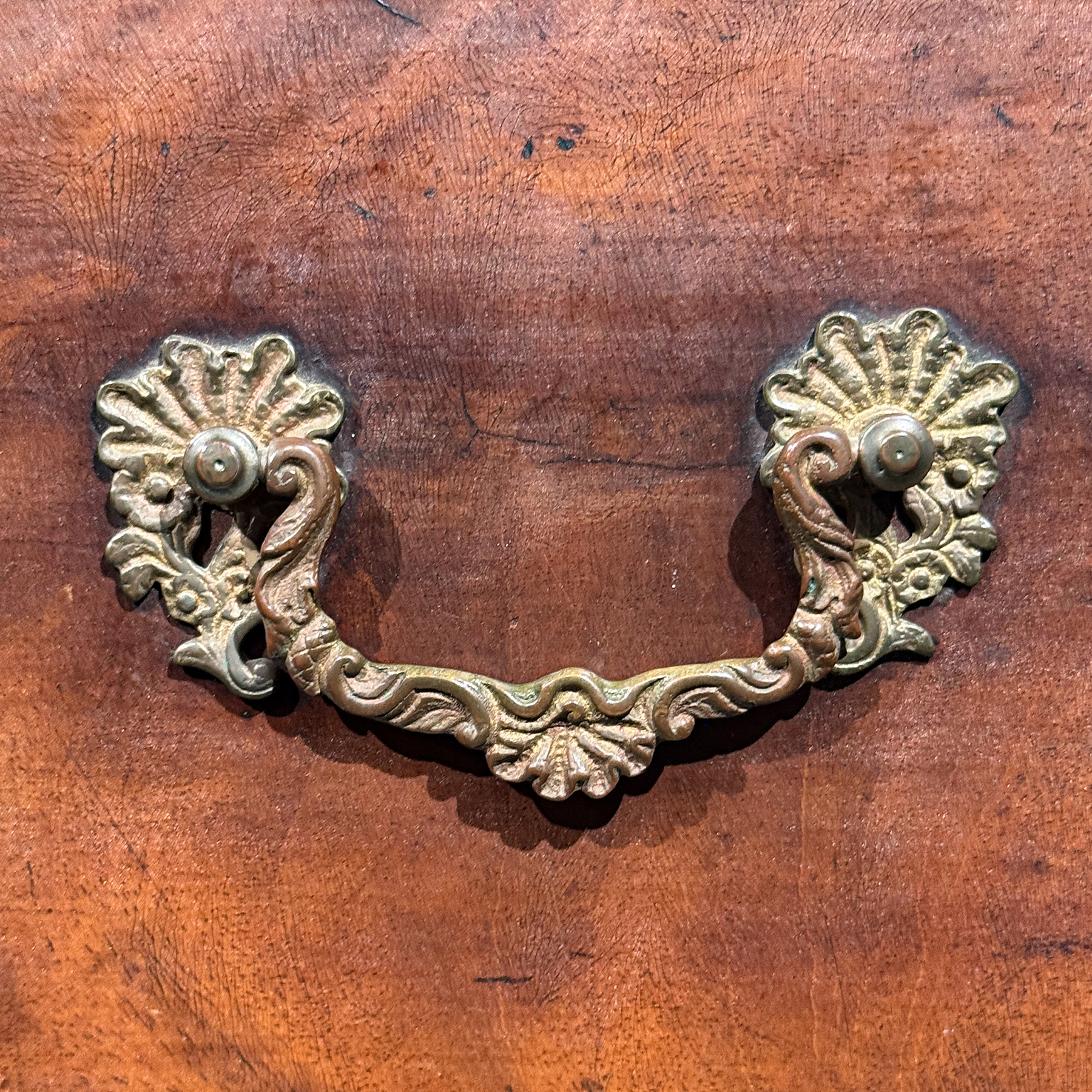 Clearly the chest has been attended to in a furniture restoration shop. A skilled carver made the new knee returns. There are many drawer lip repairs and a mahogany top was made. This was all done before the late 1920s or early 1930s when photographs were made for Hornor’s Blue Book. Joseph Packard Laird, Sr. MD (1876-1927) may have acquired the chest in the early years of the twentieth century though it is not known whether he commissioned the work or if it had been done prior to his acquisition of the chest. There is no way to know when the restoration work was done or how long the current brass has been with the chest.