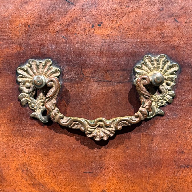 There is not a clear witness on the drawers of an earlier set of handles. I didn’t remove any of the current handles at the auction preview, I suspect that will be done soon, if it hasn’t already, to determine if any information can be obtained about a design of the original brass.