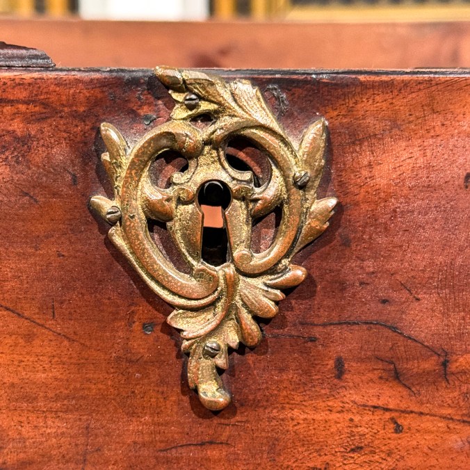 She went on, “This floral back plate pattern was popular and heavily reproduced. The floral rosettes on this chest look like reproductions of reproductions of reproductions to me. The bails just look like reproductions though.”