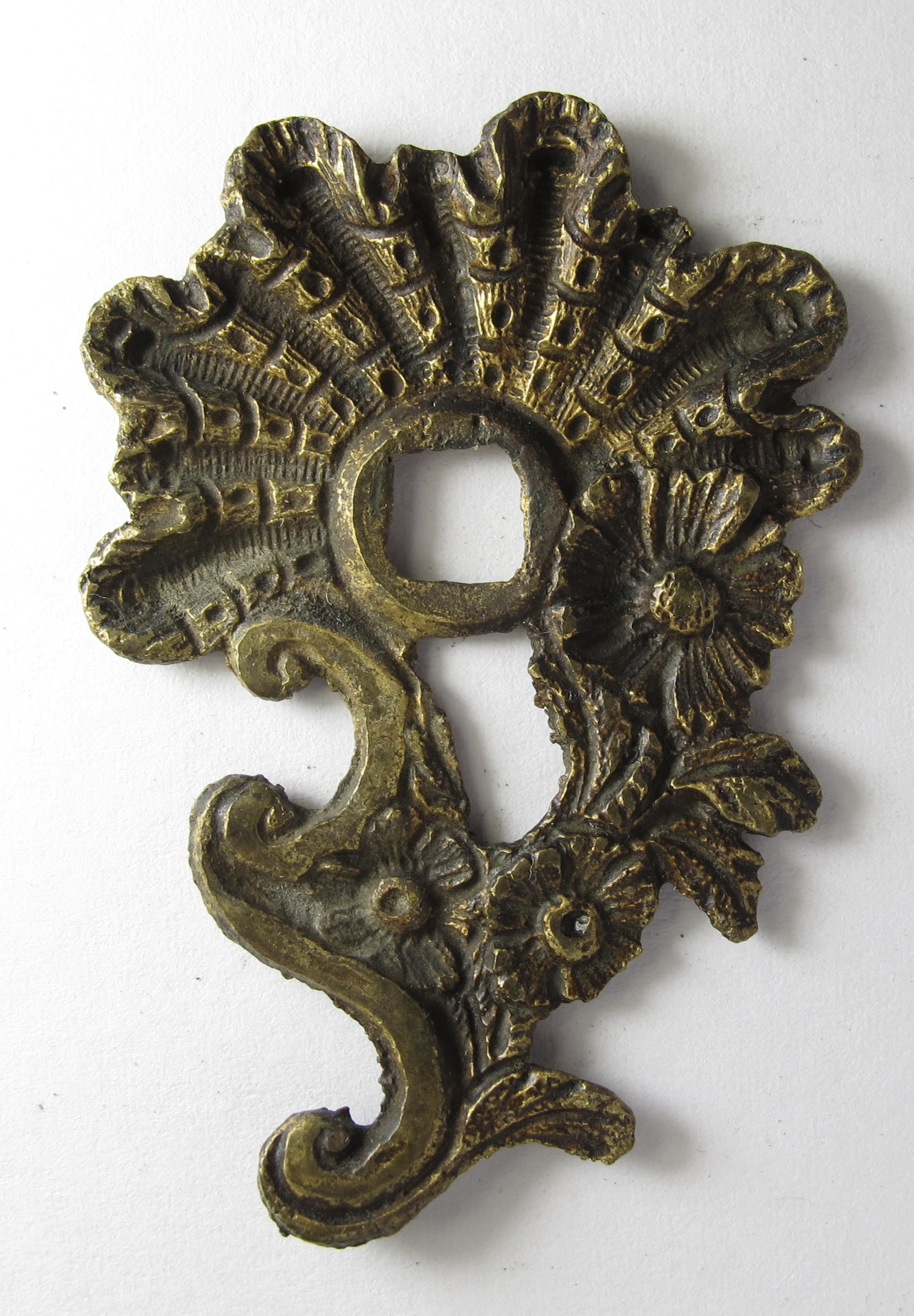 On inspection in person, there was problem with the fancy escutcheon. There is evidence of two to three previous escutcheons. There is a large hole behind the escutcheon, scoring from a round or oval plate, and a series filled nail holes used to attach an earlier escutcheon, possibly the now missing original.