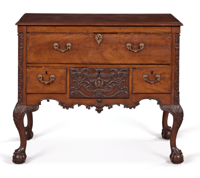 In the catalogue description of the Laird Family chest that sold on January 25, 2025 at Sotheby’s, the chest was described as appearing “to retain its original fire-gilt cast brass hardware” early in the text and later was said to retain “its original fire gilt brass hardware.” The wording is slightly different, the first quote seems to allow for the possibility that the chest may only appear to retain its original brasses while the second quote unequivocally states that the chest does retain its original cast brass hardware and that it was fire gilt.