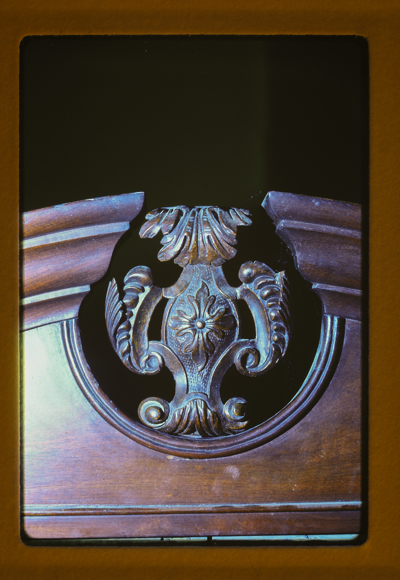Photograph of a slide made in 1999. The earliest known Philadelphia cartouche. C. 1740. Mahogany. Private collection.