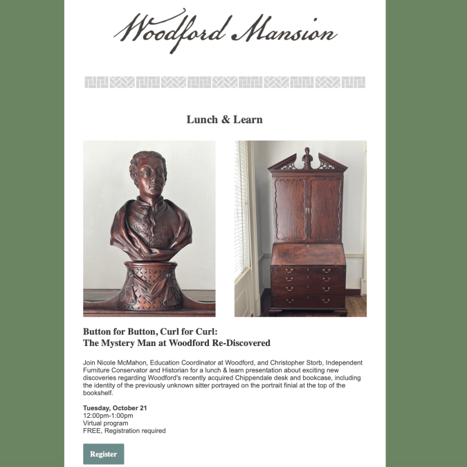 Join us at 12 noon on Tuesday October 12 for a free, open to all, program on recent research into the identity of a carved portrait bust finial on a desk and bookcase made in Philadelphia c. 1770 in the collection of Woodford Mansion in East Fairmount Park, Philadelphia. You can register for the event here. You can also sign up for the program at Woodford Mansion’s website under the Events tab.